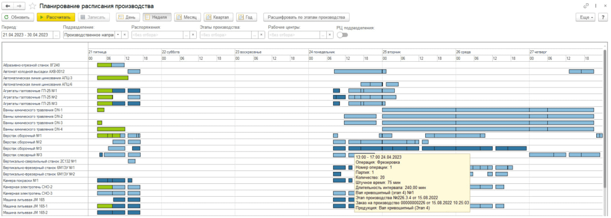 Оперативное планирование производства: формирование этапов производства, построение графика (APS-уровень) и расписания производства (MES-уровень), оперативный контроль производства и реагирование на отклонения от заданного графика, перерасчет расписания производства с учетом выбранных критериев оптимизации и текущей доступности производственных ресурсов.